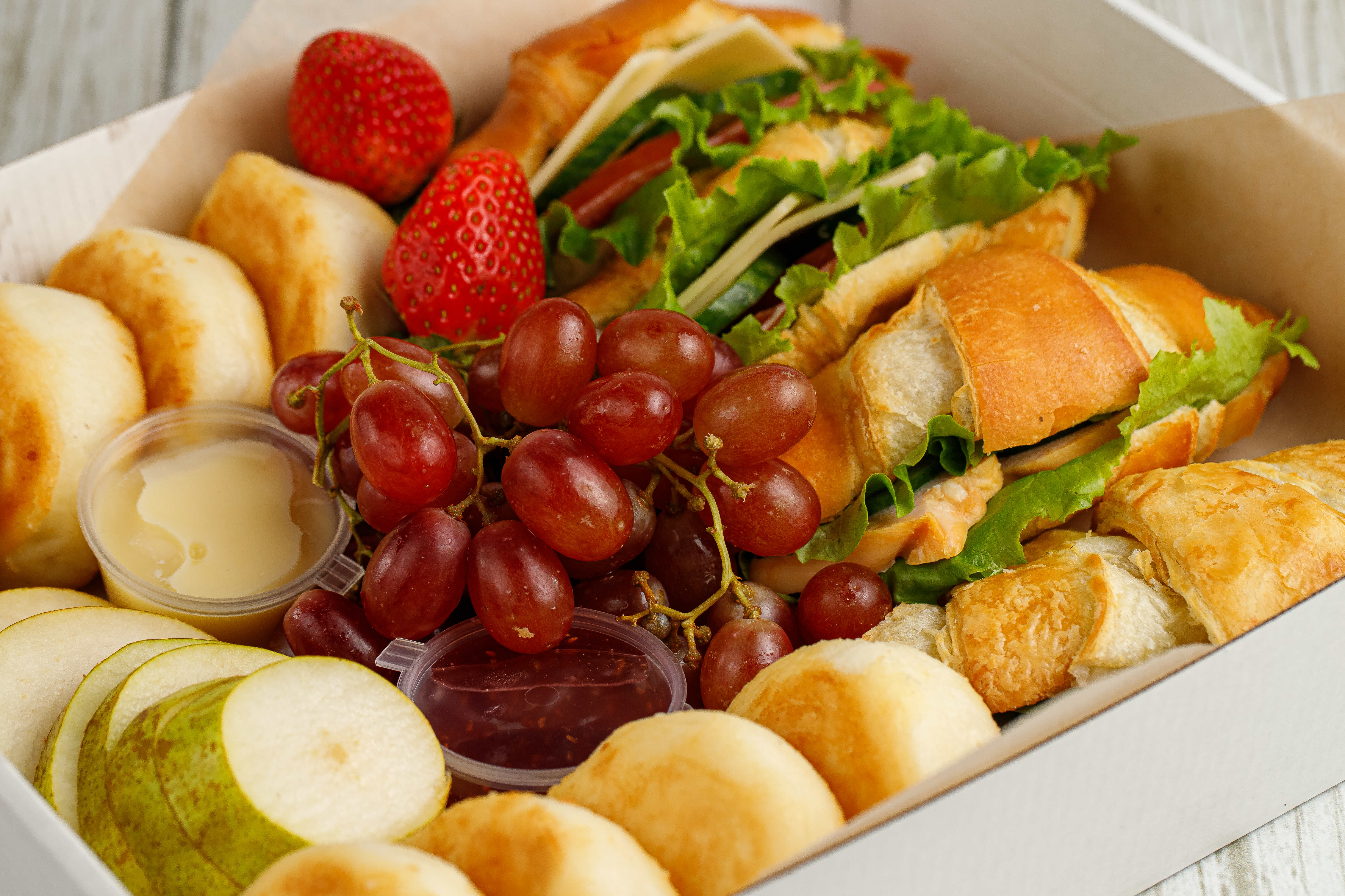 Откройте для себя утреннее удовольствие с нашим Бранч Боксом! Сочетание свежих круассанов (ветчина+сыр и копчёная куриная грудка), аппетитных сырников, фруктов — груши «Конференц», винограда без косточек и сладкой клубники. А к ним ягодный джем и сгущёнка для идеального вкуса. Уютное утро начинается у вас дома уже сейчас!