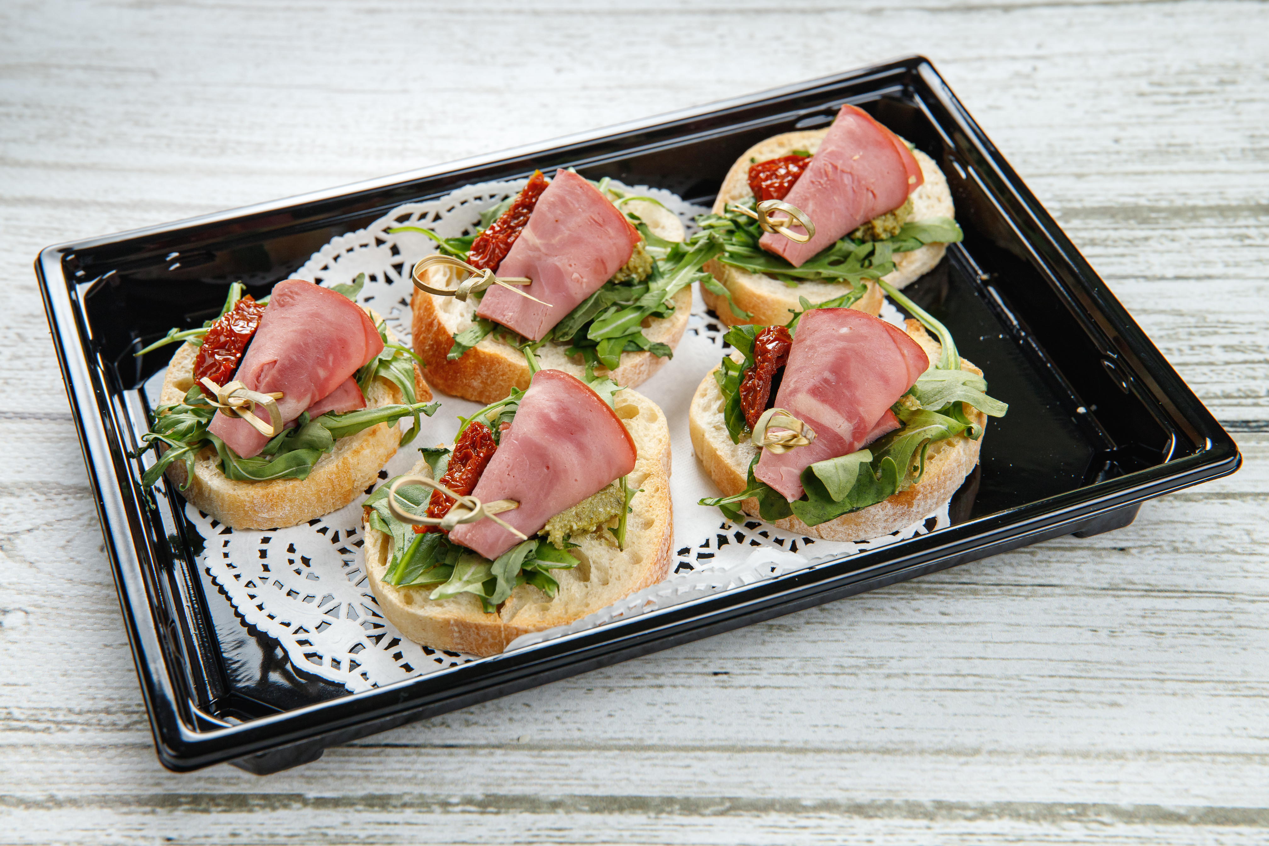 Наслаждайтесь изысканным вкусом нашего авторского тапоса! Пшеничный багет хрустит, руккола дарит свежесть, а нежнейший соус песто гармонично сочетается с ароматной варено-копченой говядиной и сладковатыми вялеными томатами. Идеальное сочетание ингредиентов в каждой крошке — это больше, чем еда, это гастрономическое удовольствие всего в 30 граммах.