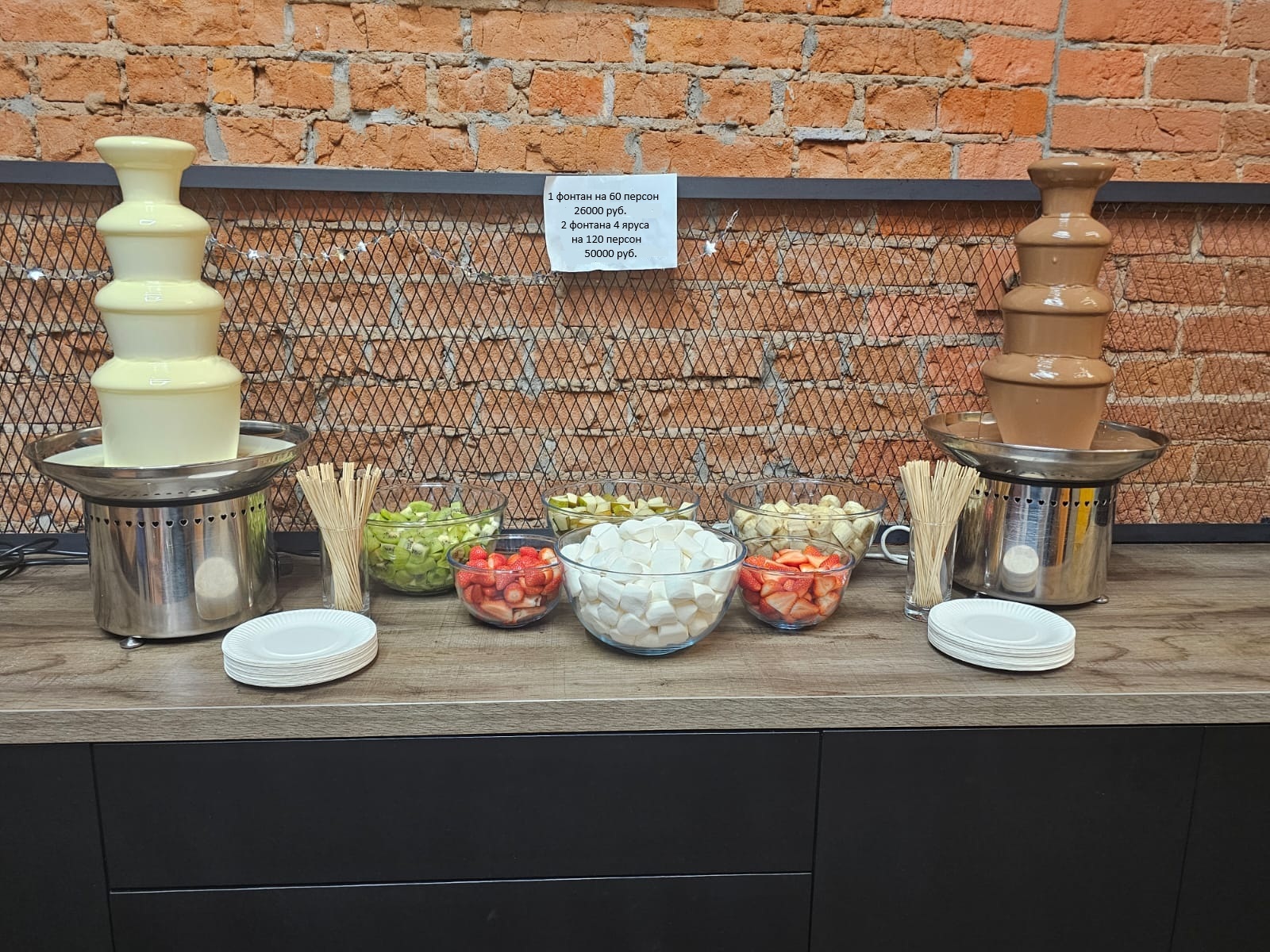 — Доставка и вывоз оборудования (до 23:00)Вас ждёт сладкий праздник с нашим шоколадным фонтаном! Молочные и белые реки шоколада, воздушные маршмеллоу, ароматная клубника, бананы, груши и киви – всё это на вашем мероприятии! Наш комплект включает установку фонтана, удобную подачу продуктов и шпажек, а также доставку и вывоз оборудования до 23:00. Создайте незабываемую атмосферу сладкого наслаждения вместе с нами!