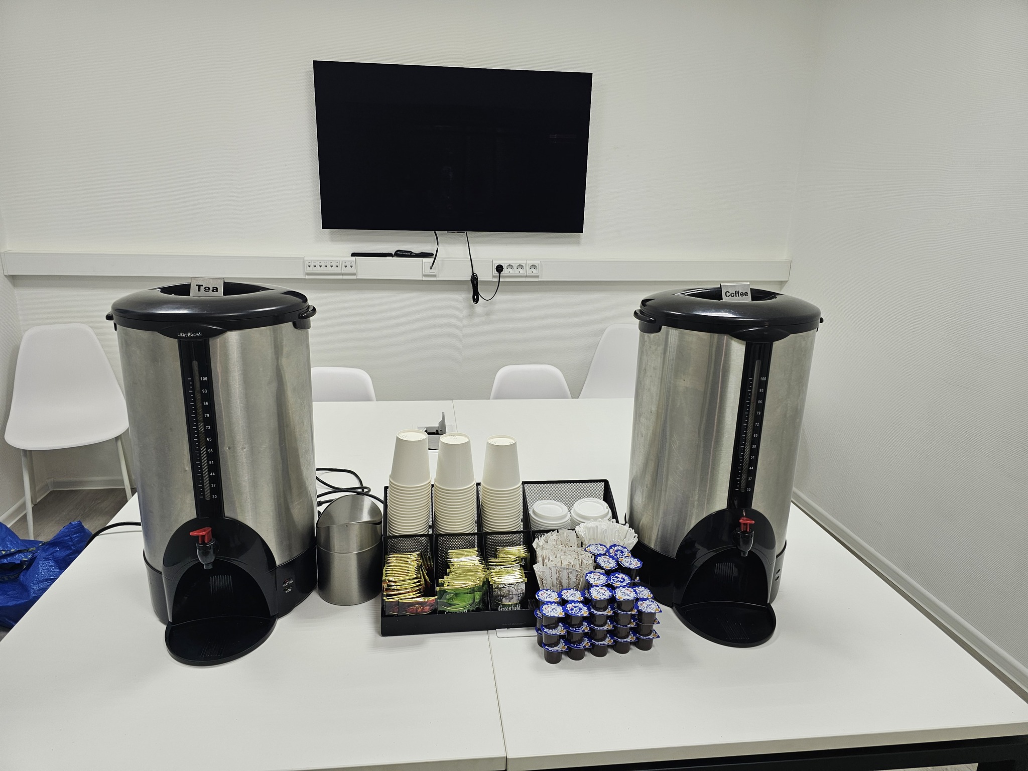 Полностью готовая к работе станция на 75 порций заварного молотого кофе, 75 порций чая ассорти, стаканчиков, сахара, сливок.