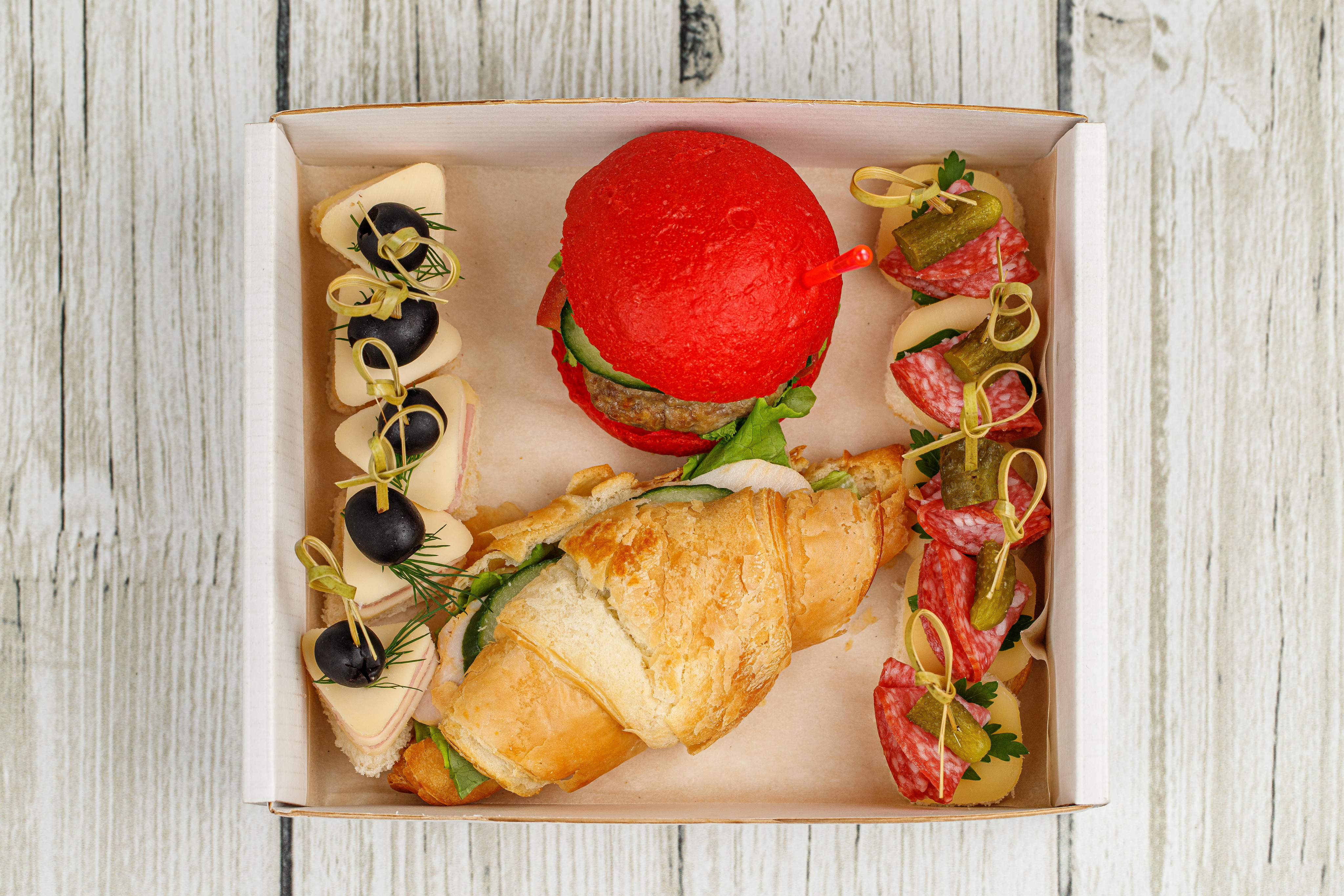 Вкусное начало дня начинается здесь! Мини-бокс объединяет в себе лучшие гастрономические традиции: нежный круассан с ароматной начинкой и мини-бургер с сочным кусочком мраморной говядины. Добавьте к этому изысканные канапе – идеальное сочетание вкусов на вашем столе. Удобно, вкусно и презентабельно! Идеально как закуска для приемов, так и полноценный перекус для себя.