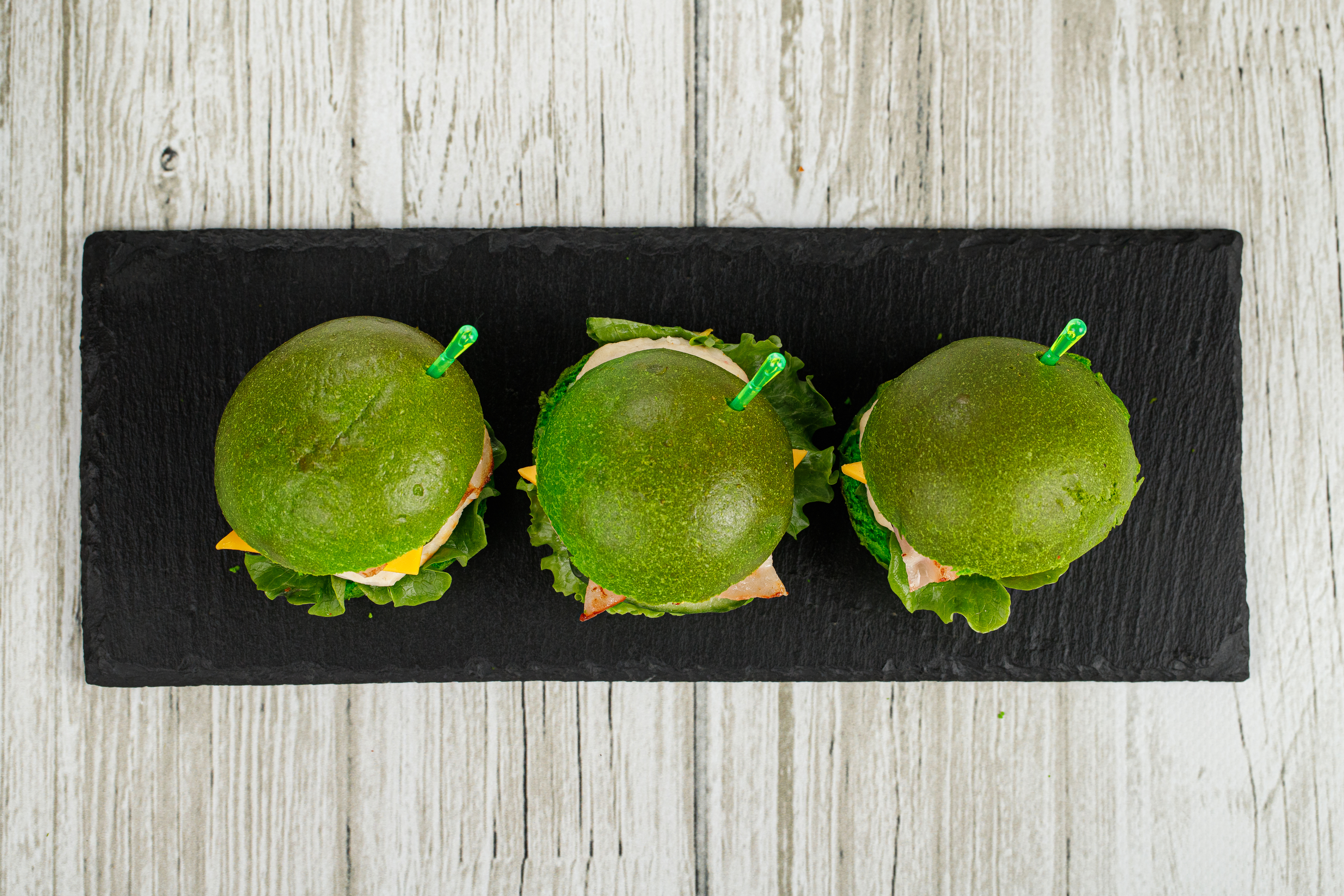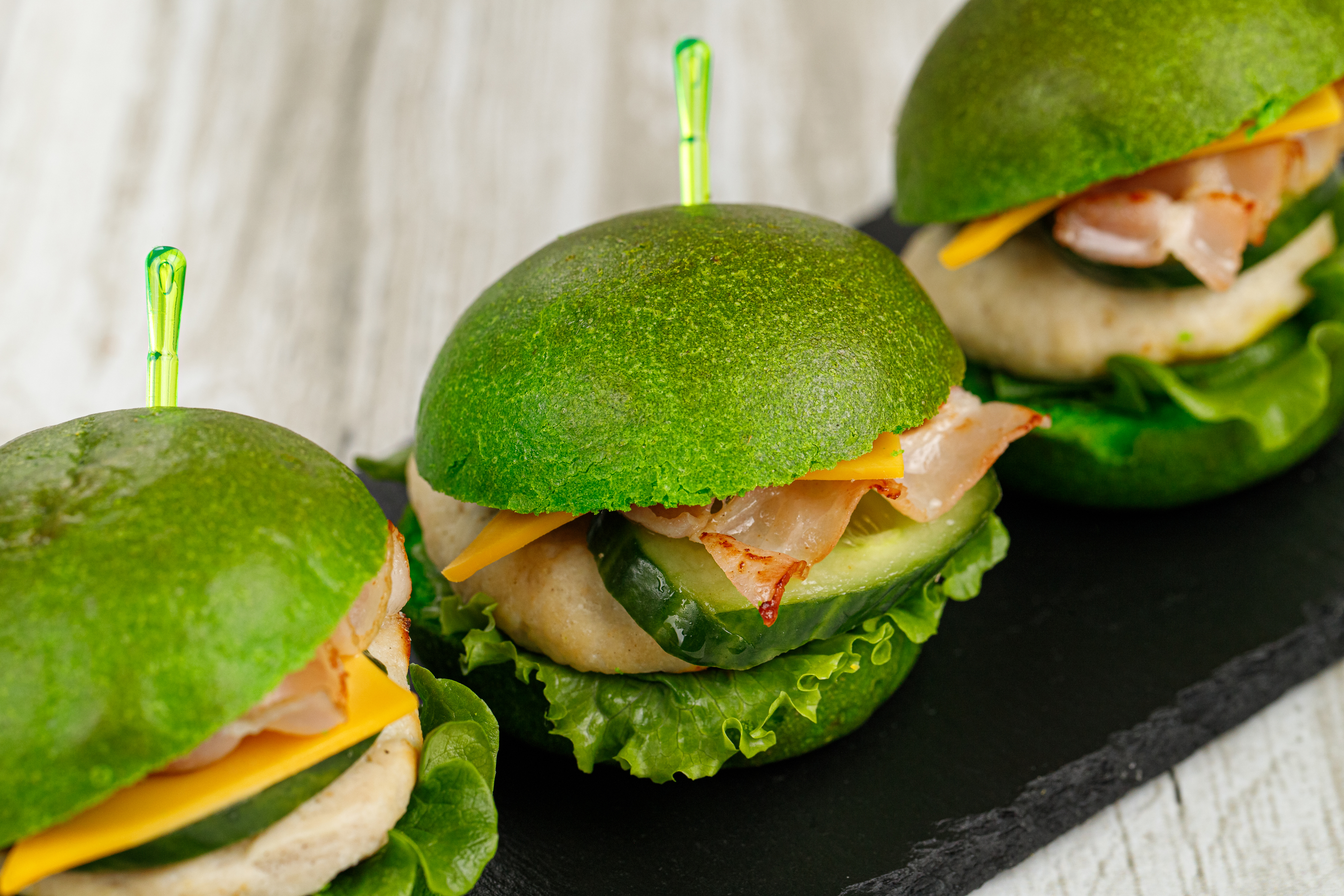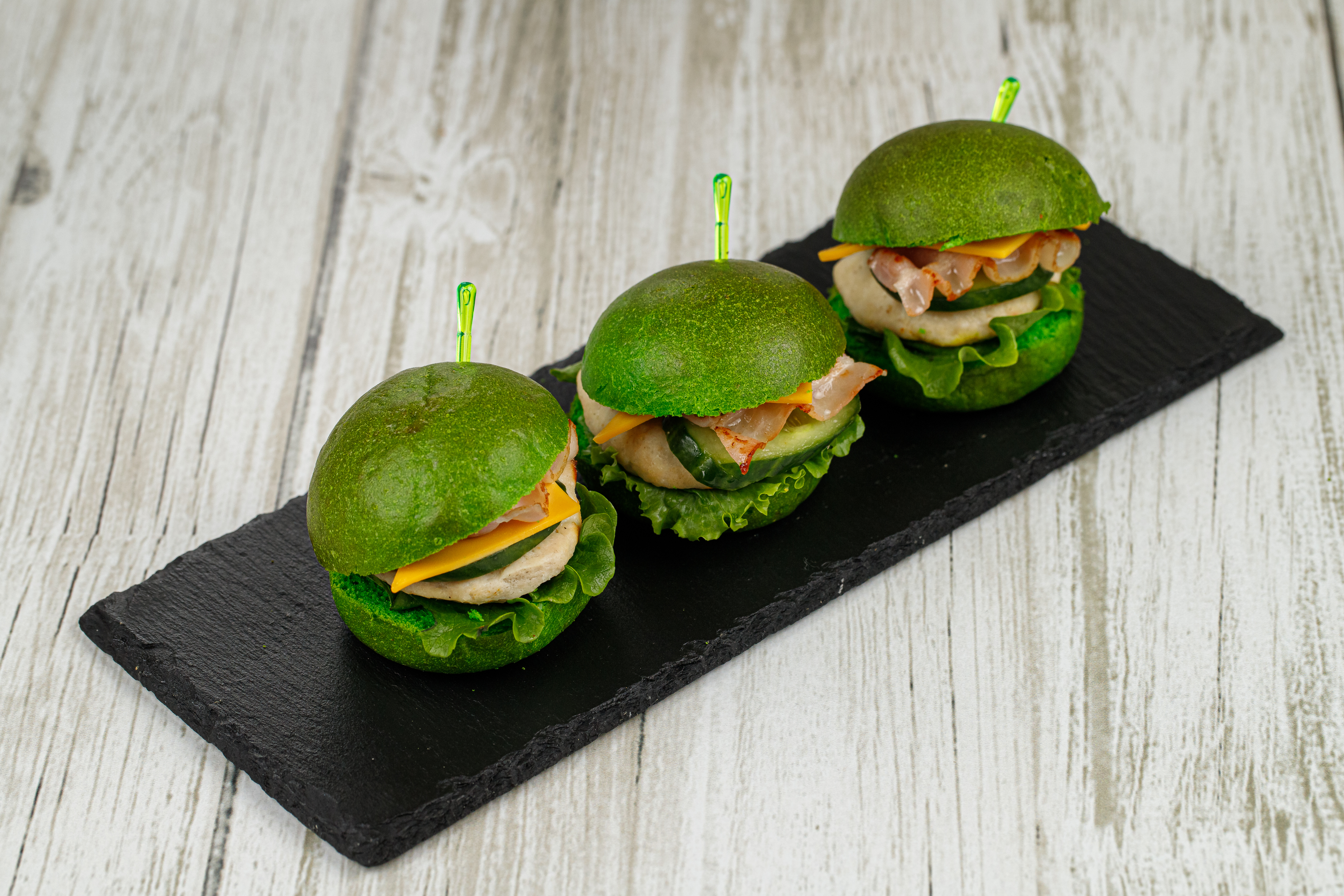 (пшеничная булочка, котлета из филе индейки, сыр чеддер, жареный бекон, лист салата, свежий огурчик, соус карри)