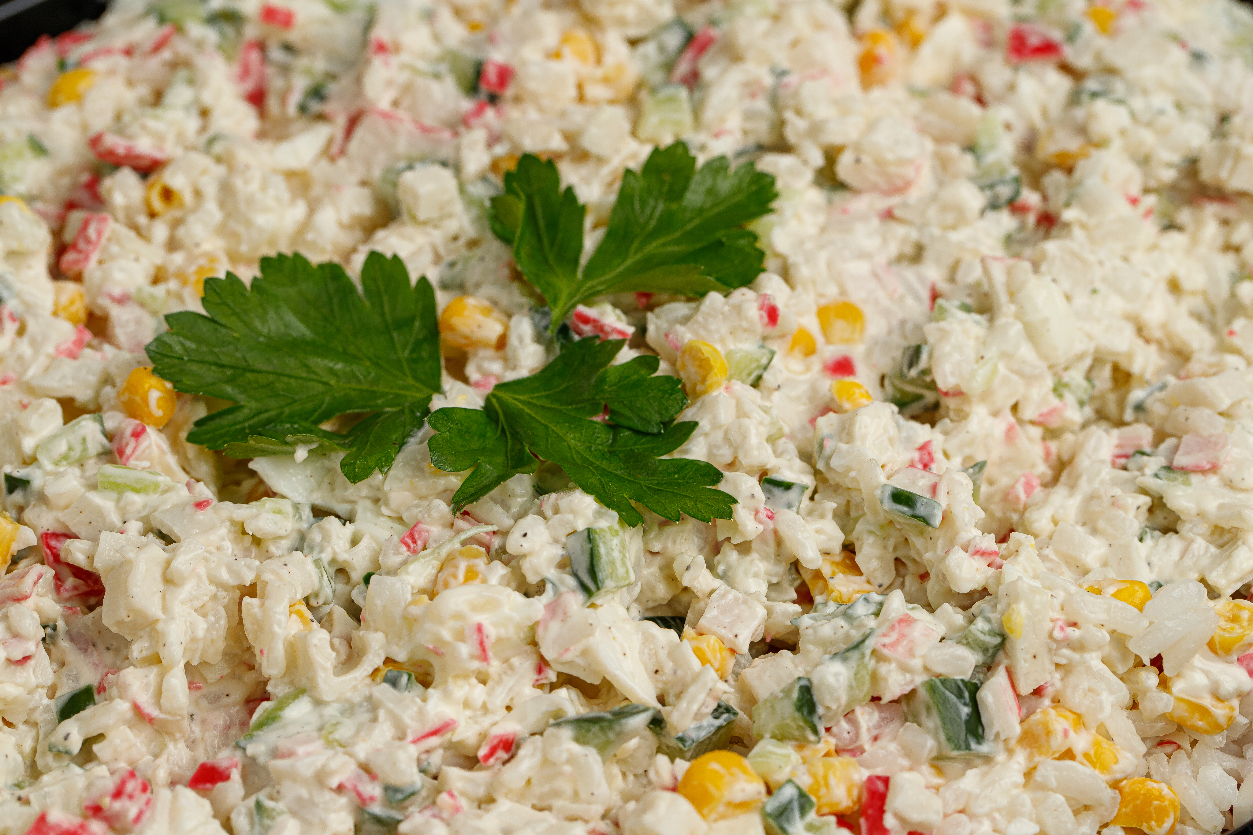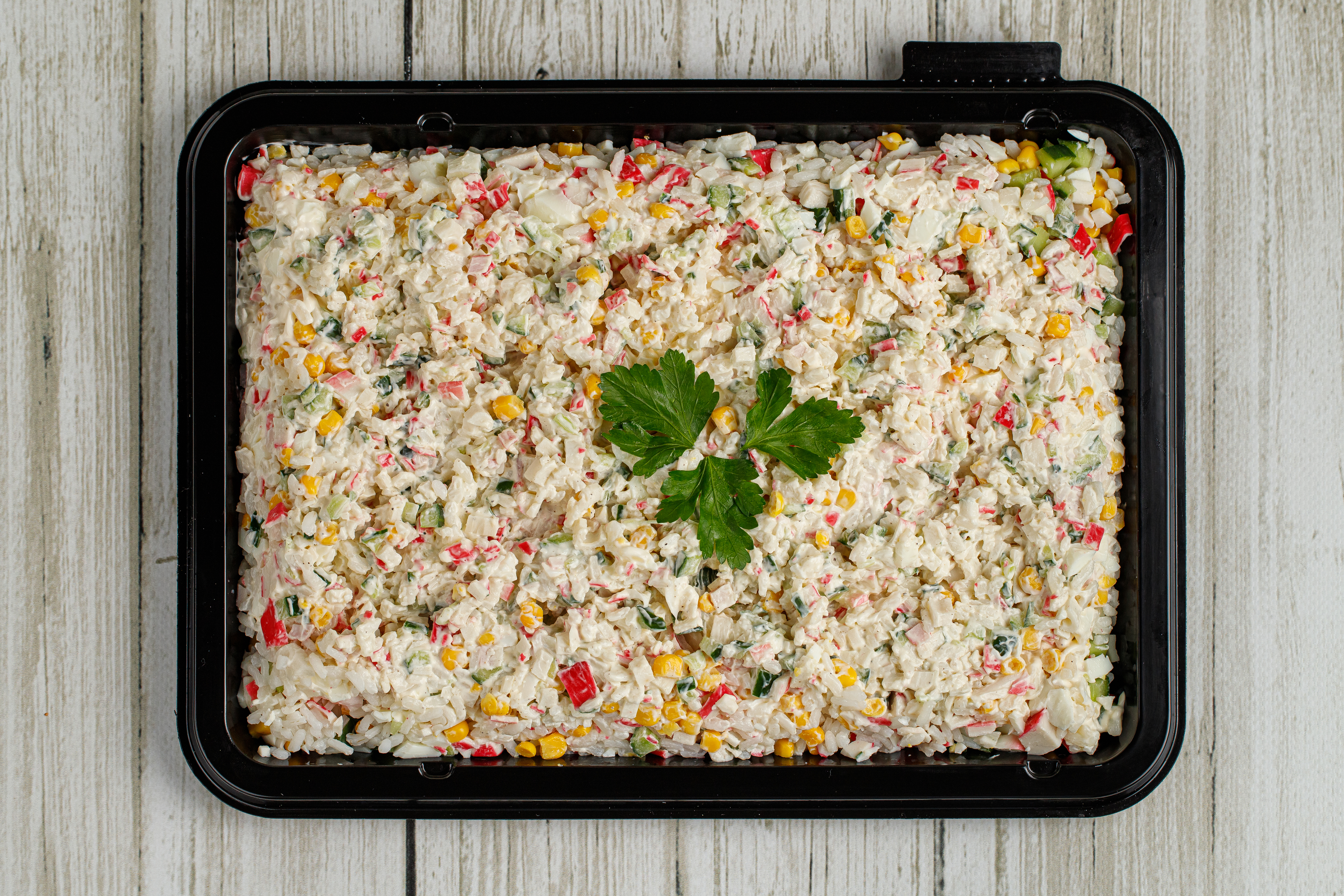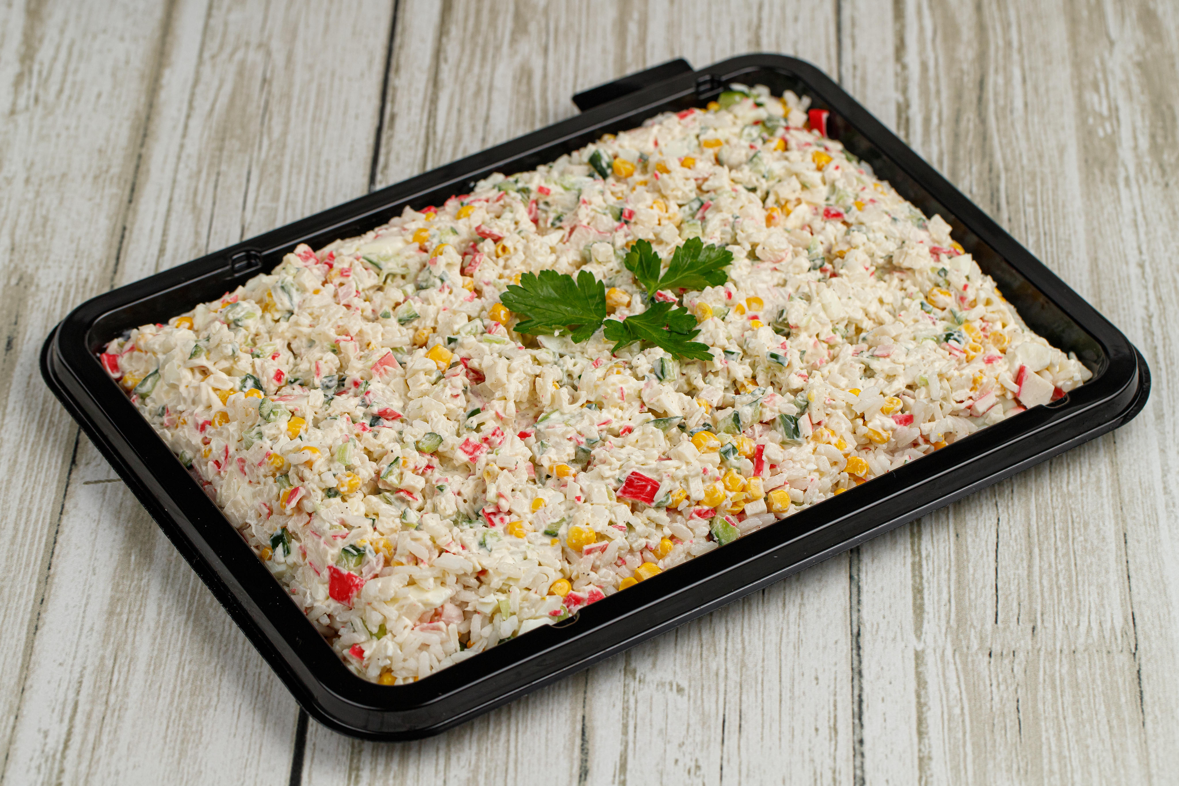 Крабовое мясо, рис, яйцо куриное, огурцы свежие, кукуруза, майонез
