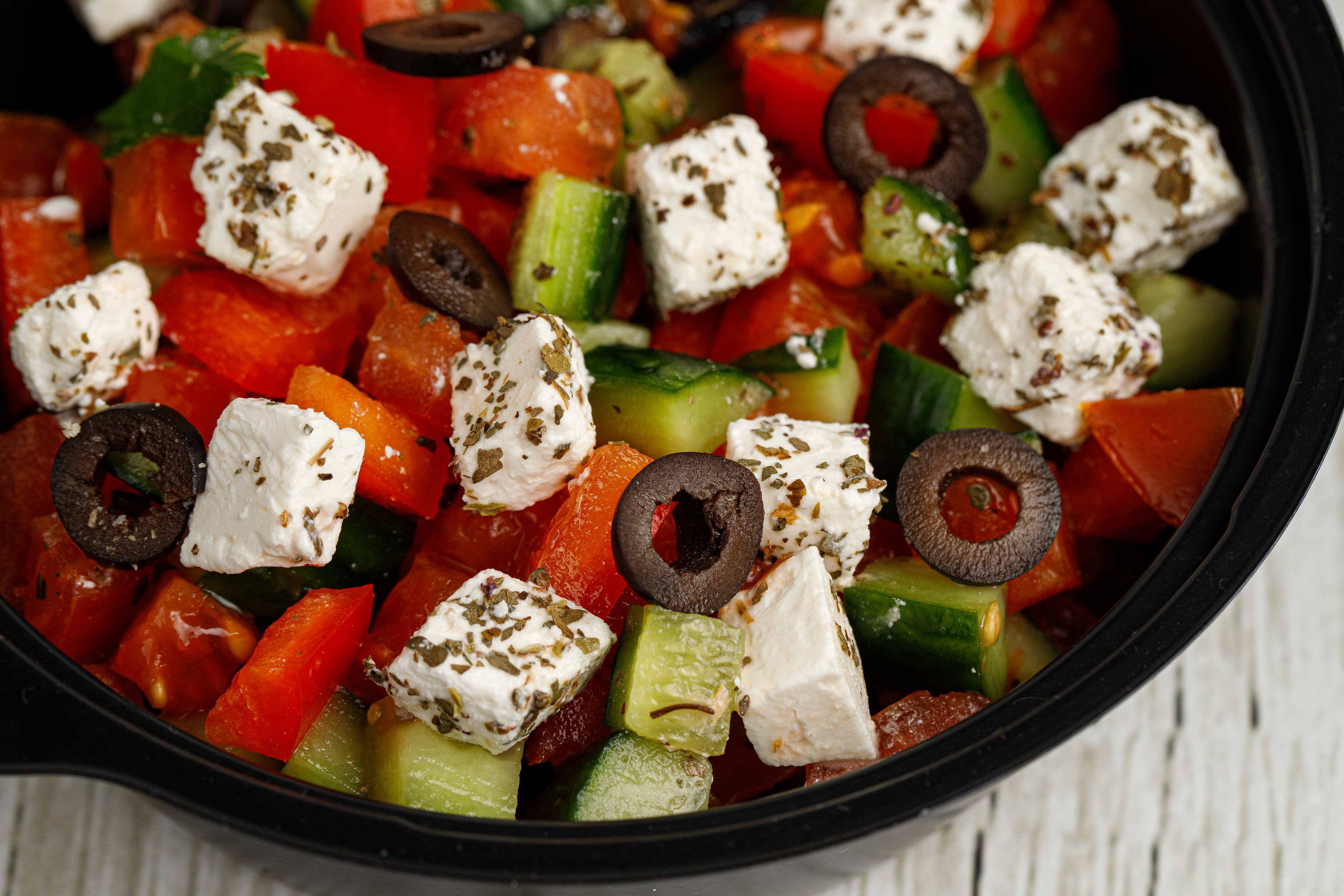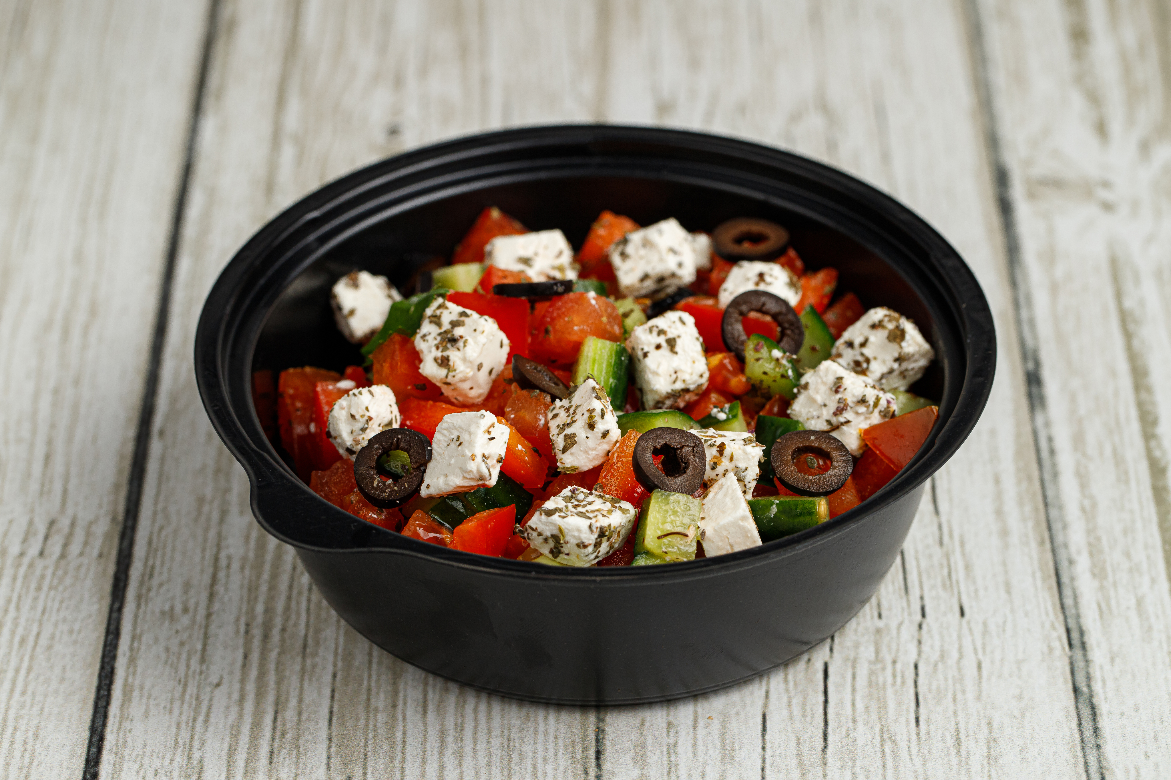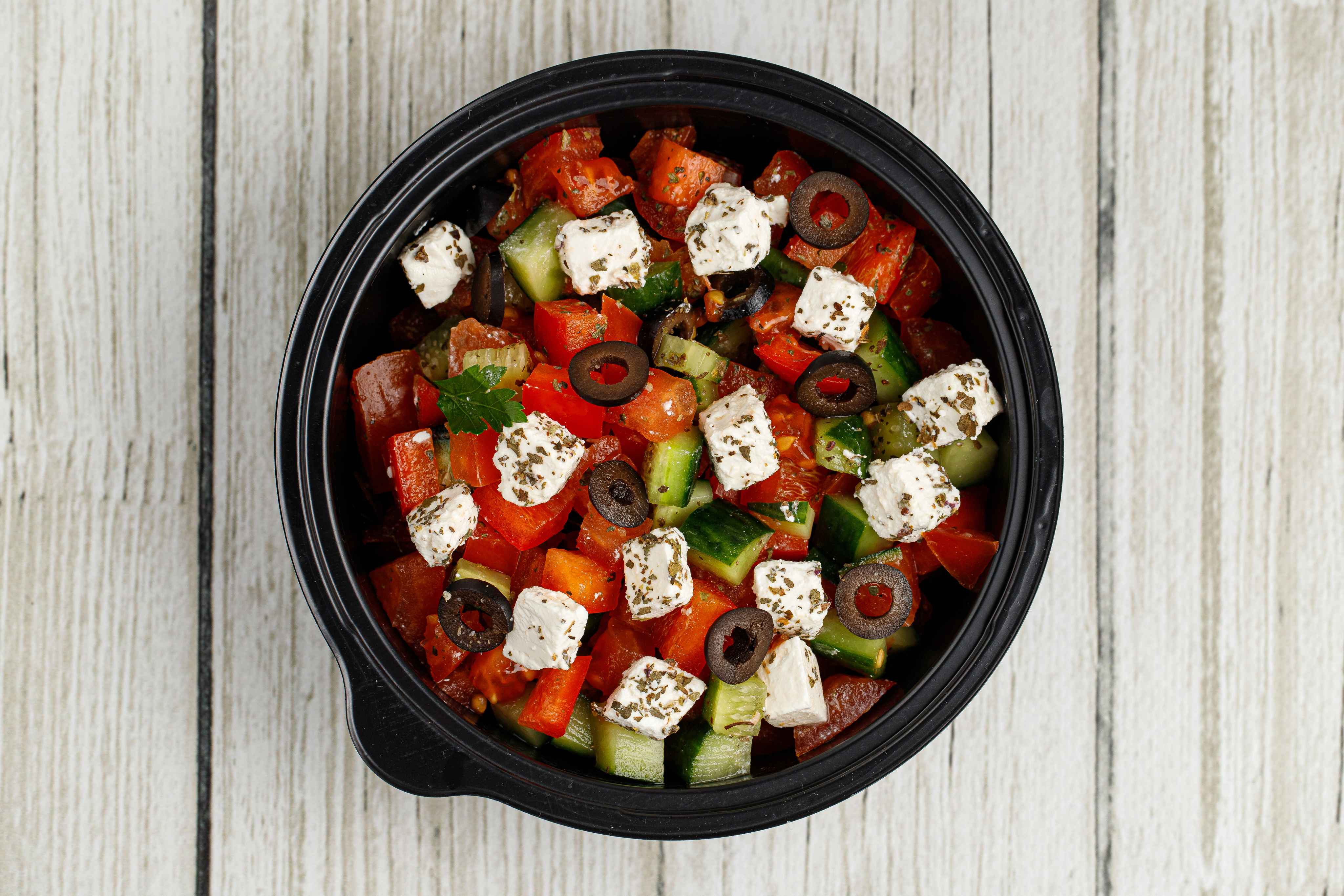 Помидор, огурец, болгарский перец, маслины, сыр фета, оливковое масло, сок лимона, прованские травы.