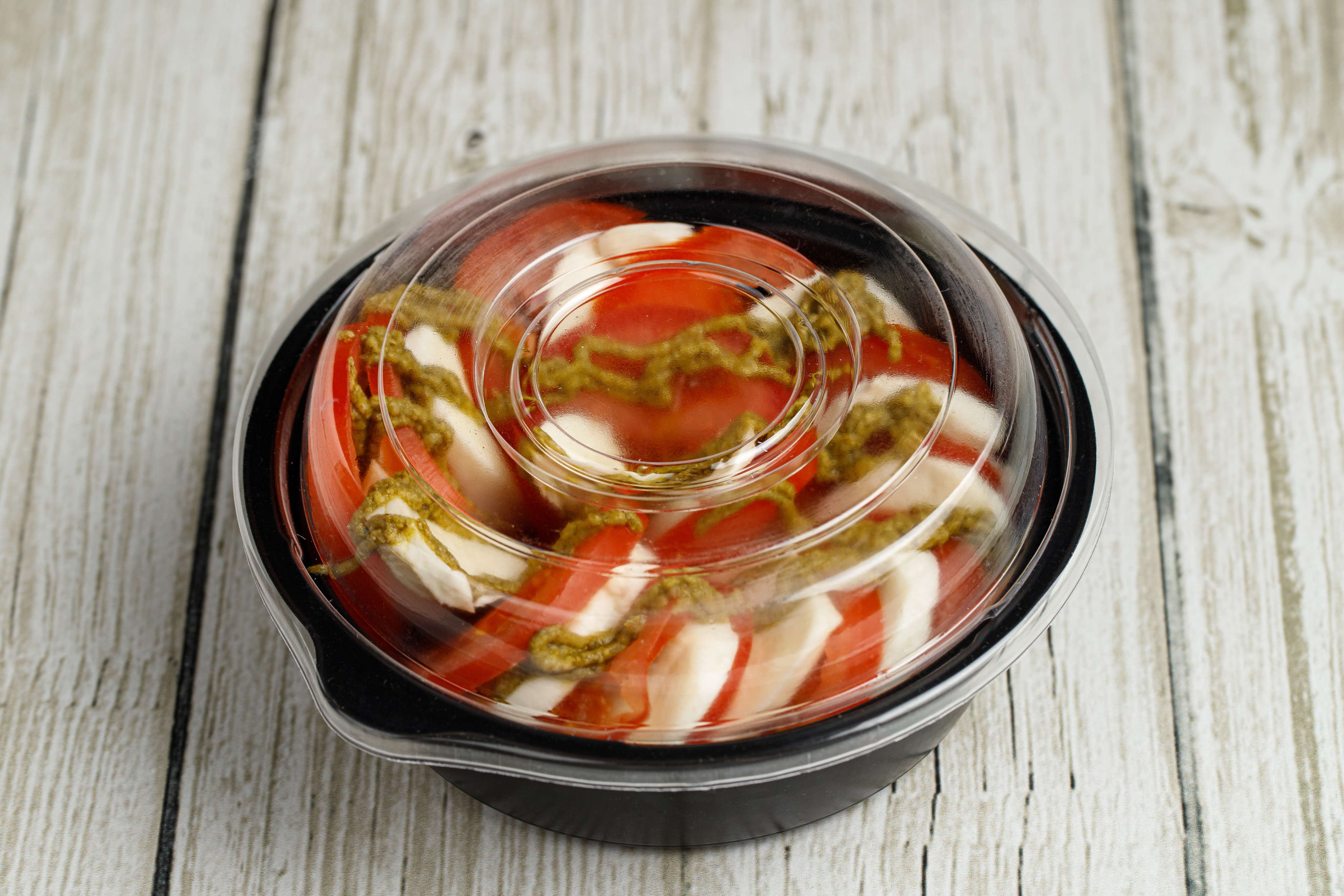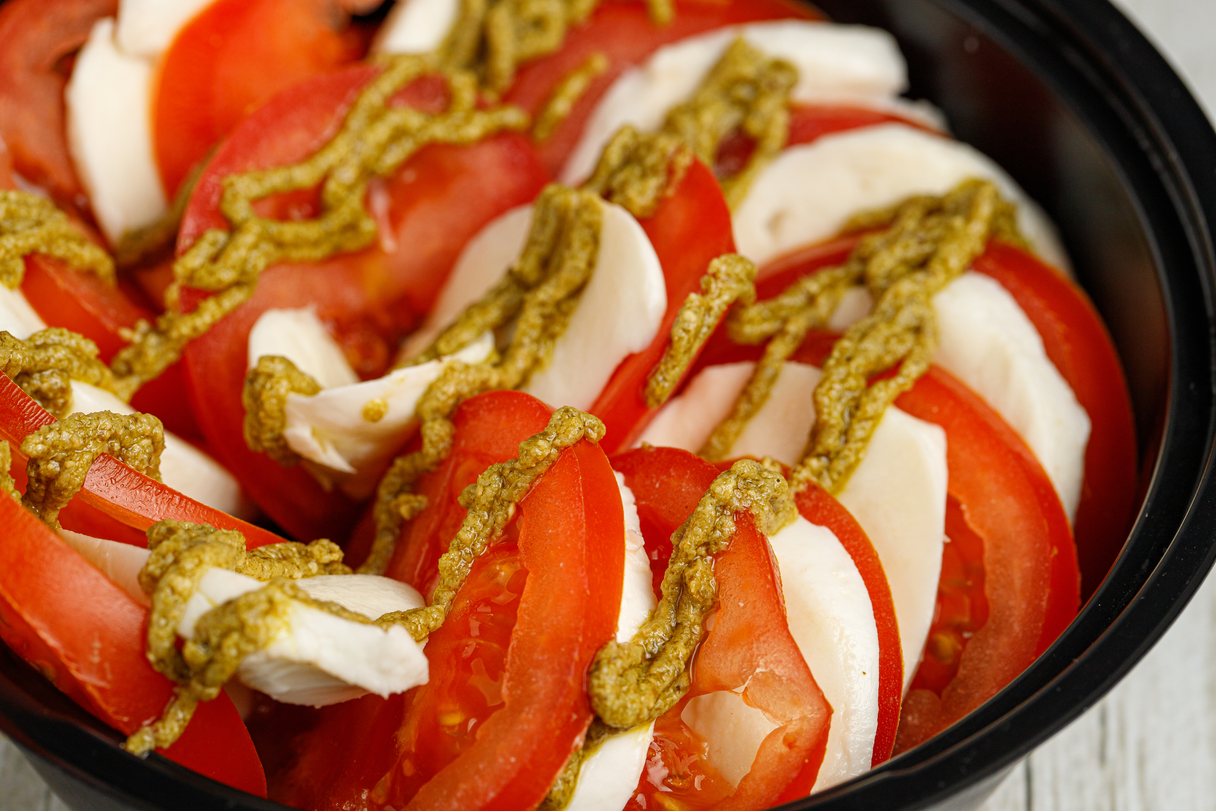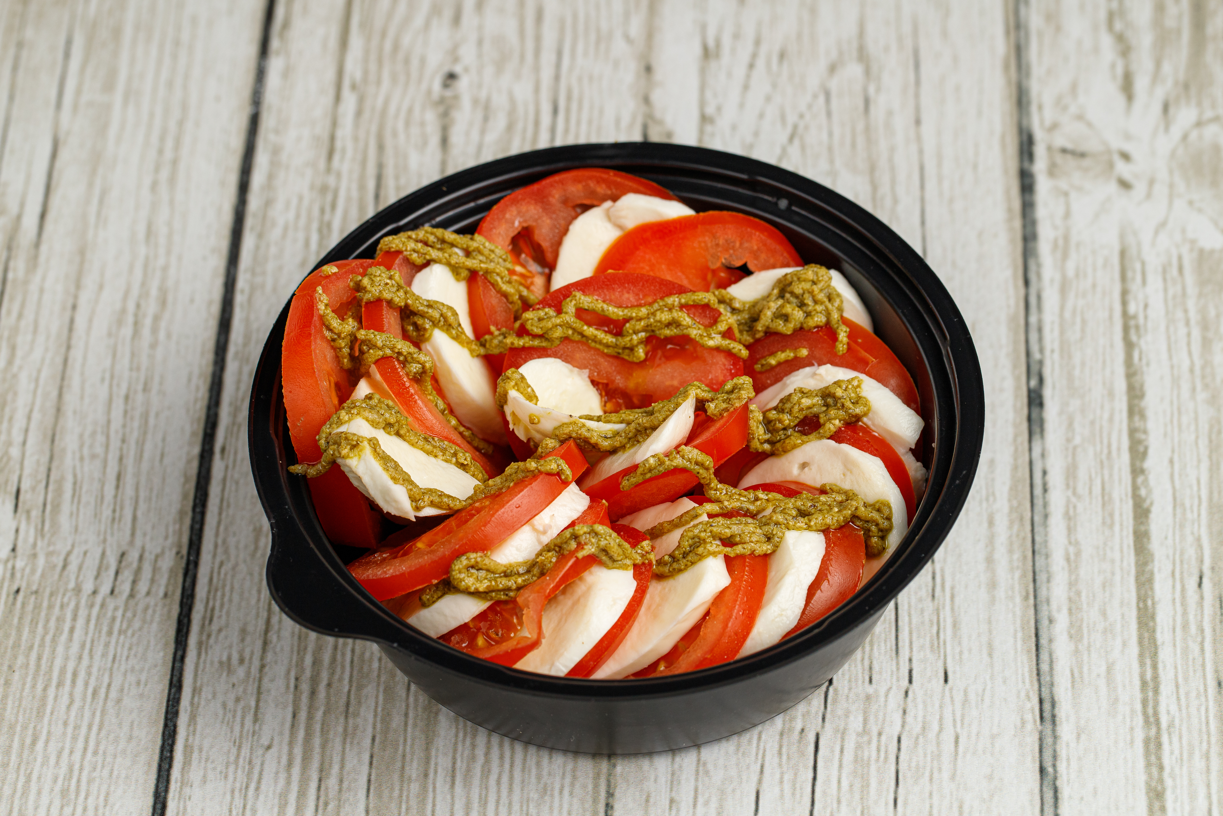Слайсы томатов, слайсы моцареллы, базилик, соус песто.