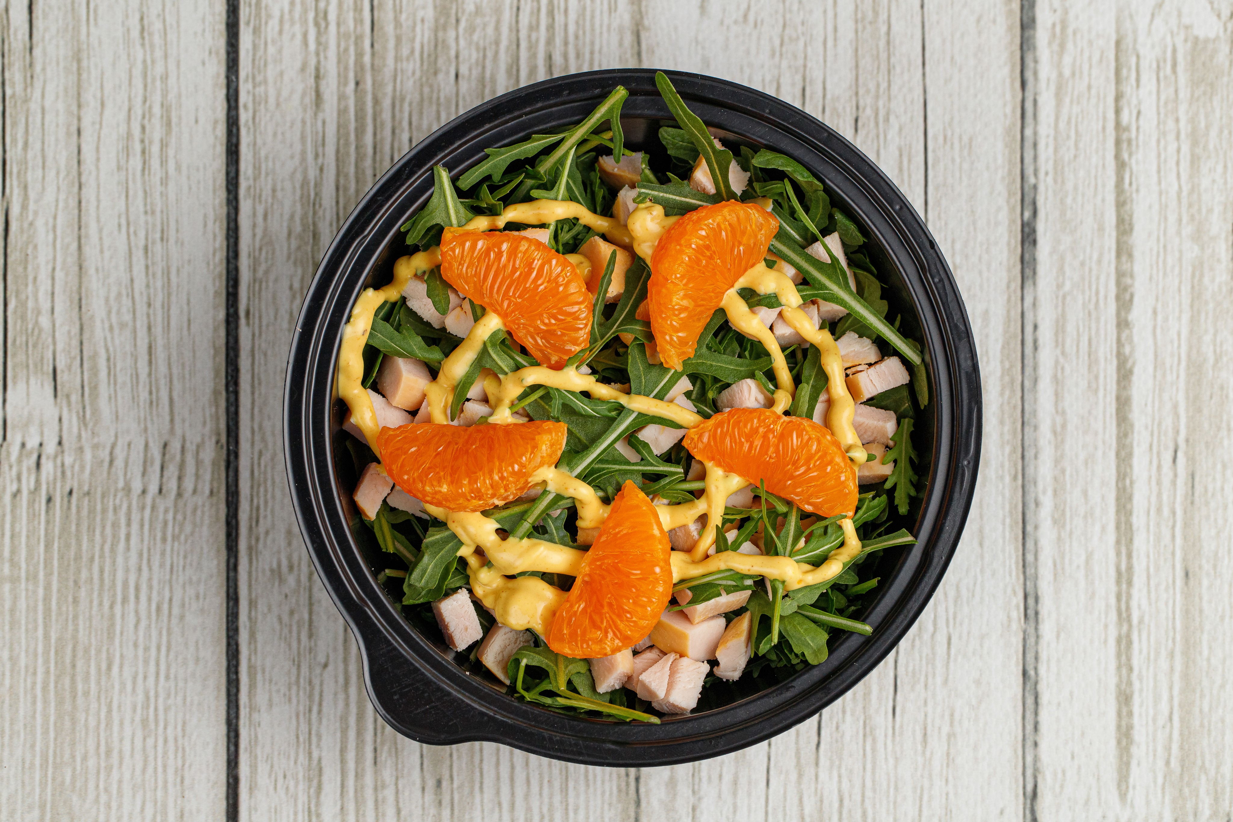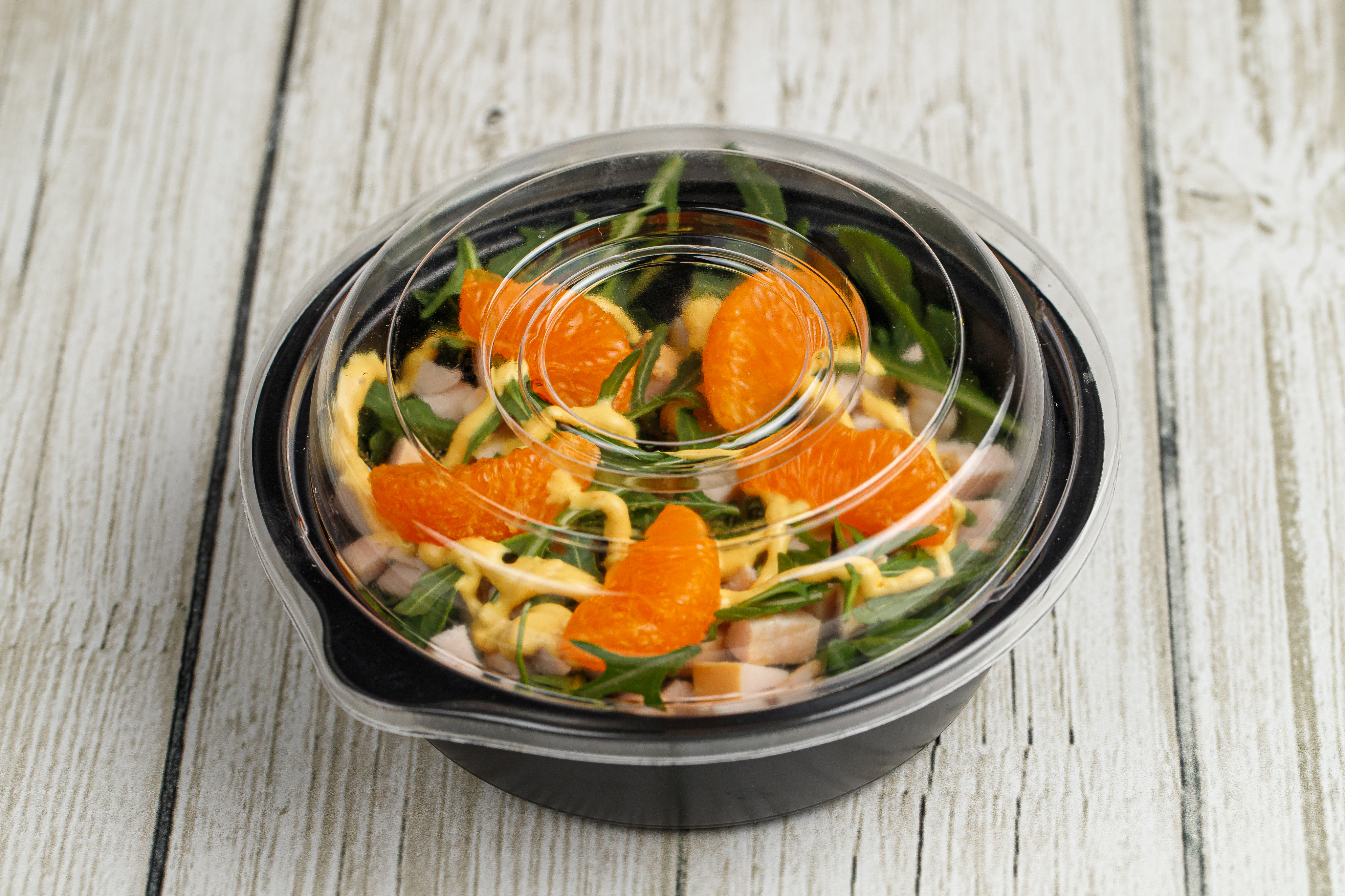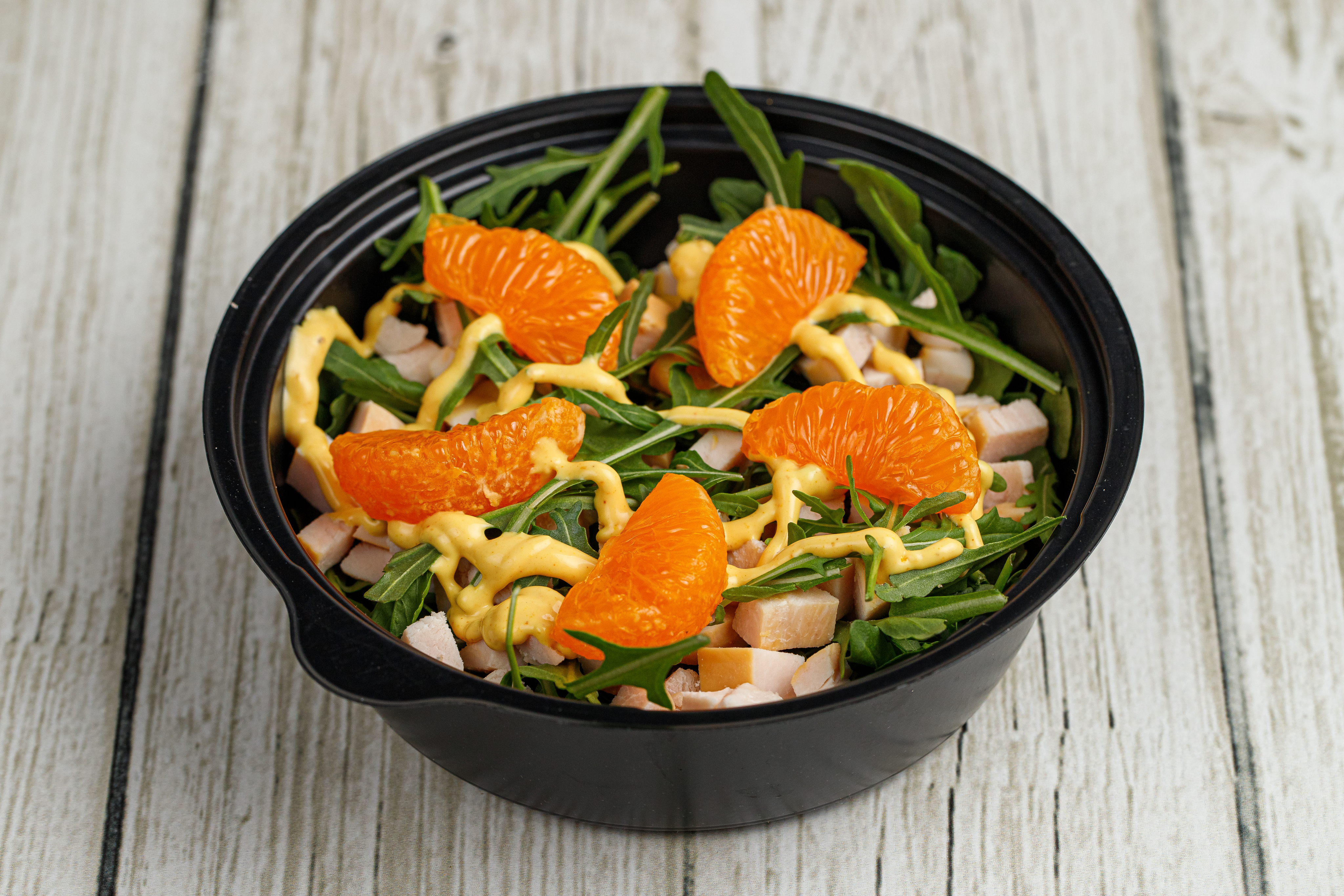 (копчёная куриная грудка,руккола,мандарин,медово-горчичная заправка)