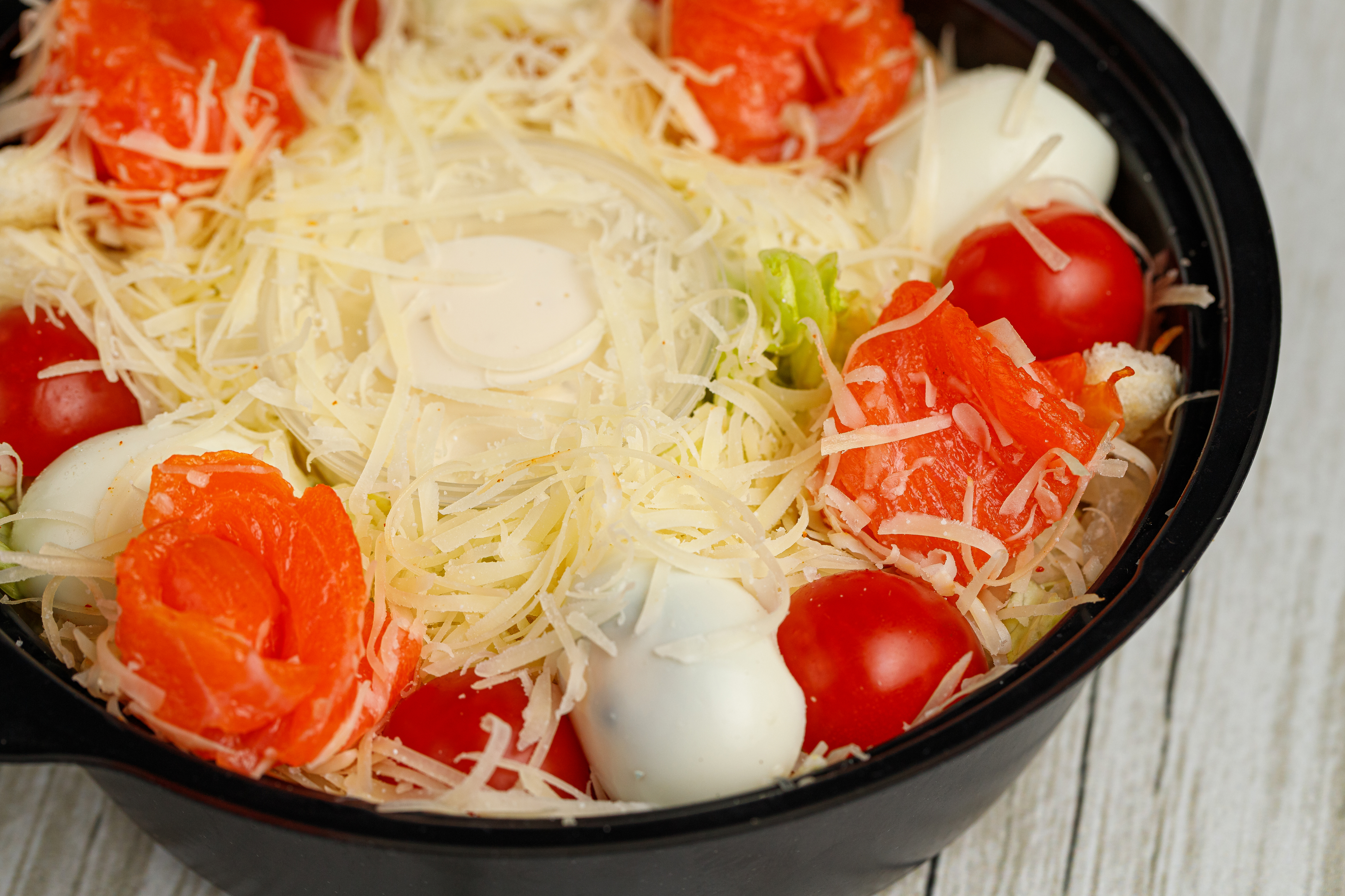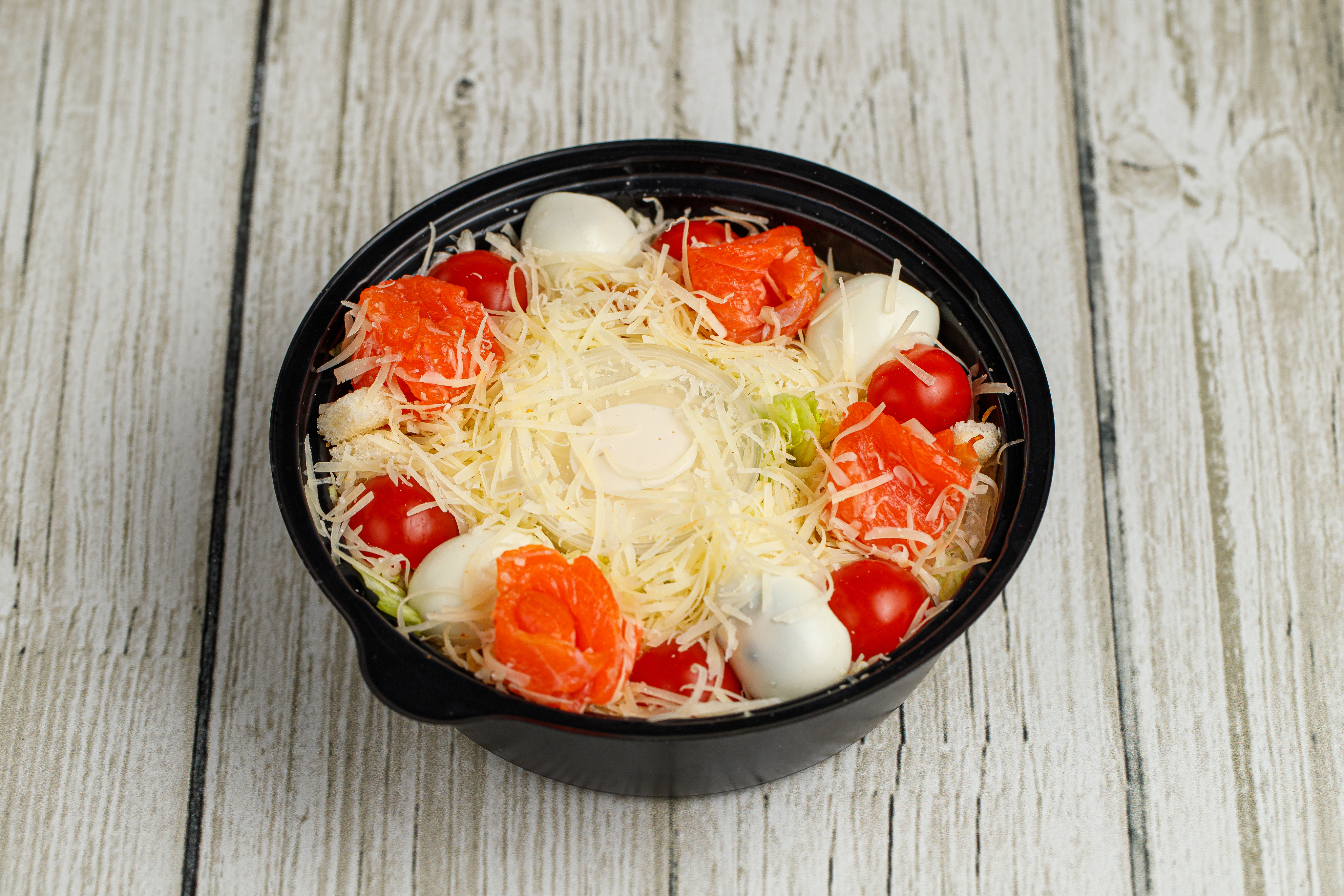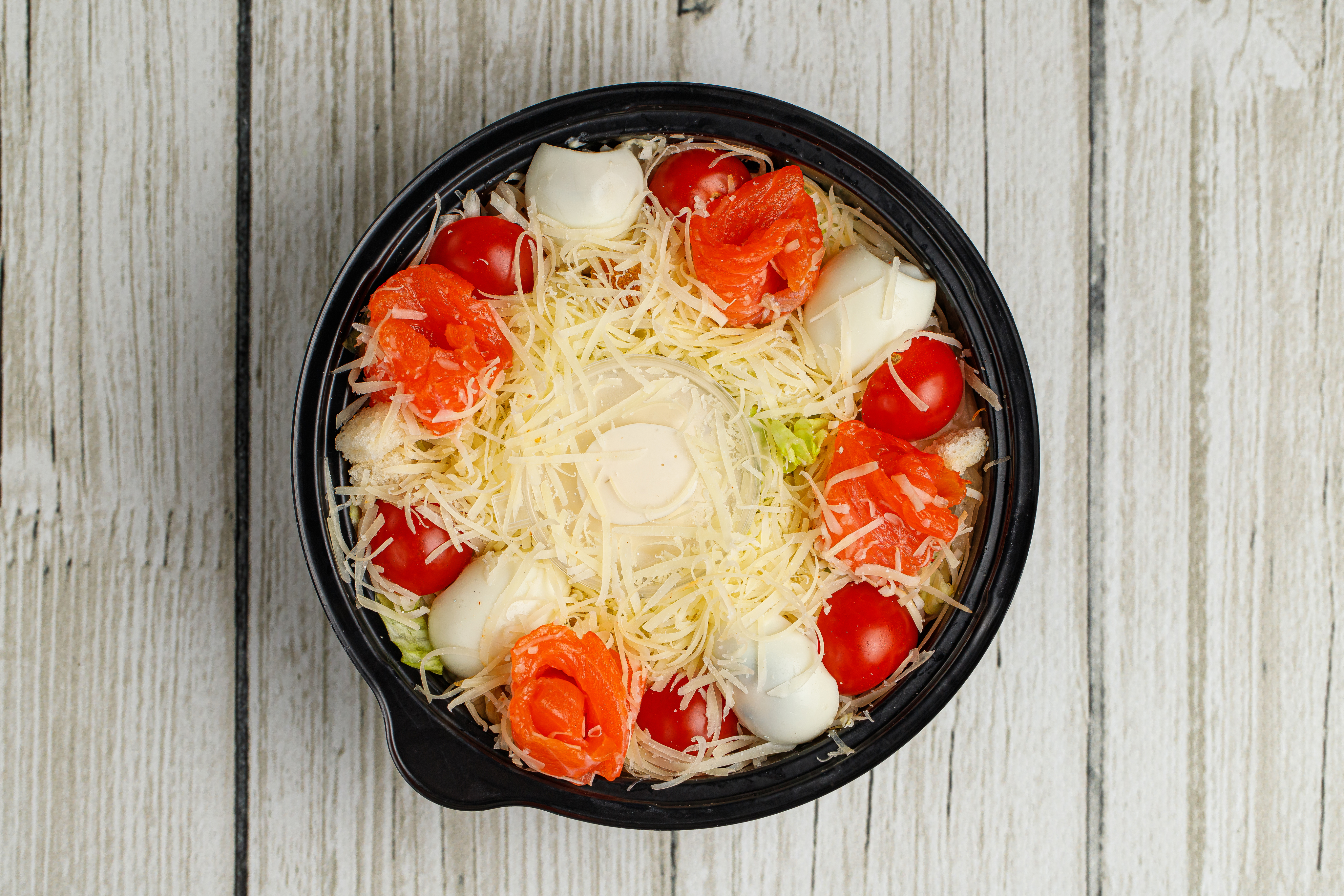 Салат айсберг, пармезан, чесночные гренки, перепелиное яйцо, соус цезарь, помидоры черри, лосось копченый.
